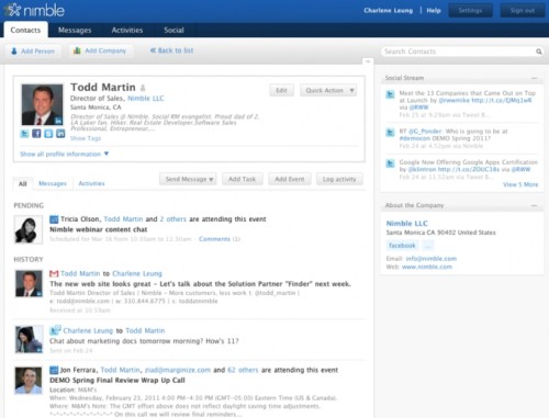 在一切皆可社会化的今天,客户关系管理(CRM)服务的社交色彩也开始变得越来越浓。该领域内的创业公司Nimble最近升级了它们的服务,升级后的Nimble 2.0版更加强调社交信息的聚合管理,试图给侧重“信息输入”的CRM服务领域带来新变化。
