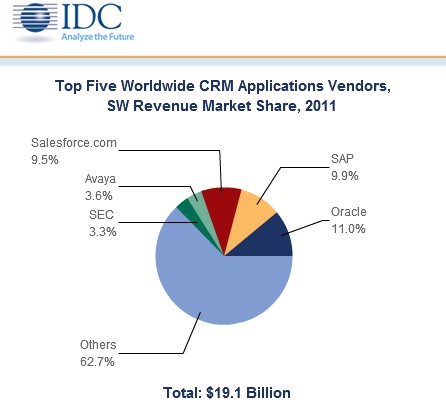 IDC追踪调查了超过190个分立的CRM供应商,发现他们的总营收增长速率在2011年下半年开始减缓。最终,2011年CRM市场营收增长率达到了11.2%。