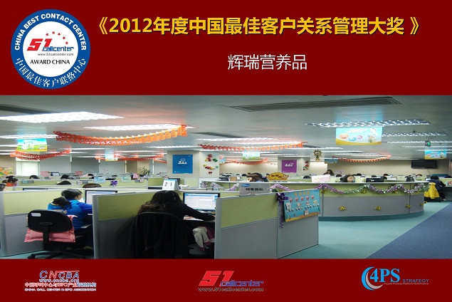 据悉,辉瑞营养品在近期举行的”2012年度客户联络中心与CRM评选颁奖典礼”中荣获《2012中国最佳客户关系管理奖》,是消费品行业唯一获此奖项的企业。该活动由呼叫中心与BPO行业资讯网(51Callcenter)主办,工信部软件与集成电路促进中心、中国呼叫中心与BPO产业联盟(CNCBA)指导,4PS联络中心国际标准作为指导标准。
