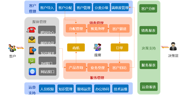 CM客户管理模块:多渠道客户资料集中、维护、分类和策略配置等统一管理功能。