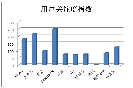 用户关注度方面,10月份,关注度最高的是 Salesforce,为253,比上月略有降低;排第二的是八百客,关注度指数分别为217,与上月基本持平;Xtools位居第三,关注度指数为180。排名四至十名的分别是甲骨文、百会、微软CRM、用友、任我行、SAP、赛捷。