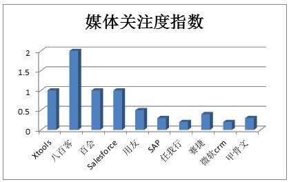 媒体关注度方面, 10月份最受媒体关注的品牌为八百客,关注度指数为2.0,Xtools、百会、Salesforce并列第二,关注度指数为1.0;排五至十名的分别是用友、赛捷、甲骨文、SAP、微软CRM、任我行。需要特别指出的是:10月份平均媒体关注度较上月大幅下降51.24%,说明本月各CRM厂商新闻活跃度整体偏低。