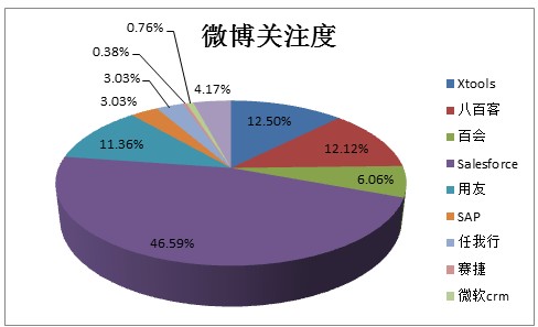 微博传播方面:据对新浪微博认证用户传播数据统计,10月份Salesforce微关注度最高,为123; Xtools排名第二,关注度为33;百会第三,关注度为32。排名四至十名的分别是用友、八百客、甲骨文、任我行、SAP、微软CRM、赛捷。