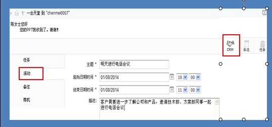 针对潜在客户建立一条新任务或新活动也不必进入CRM里去填写。无论您计划下周去拜访,还是隔天电话沟通,只要您想把您的计划放到CRM里去,不必进入CRM系统,还是可以在邮件里一步搞定。