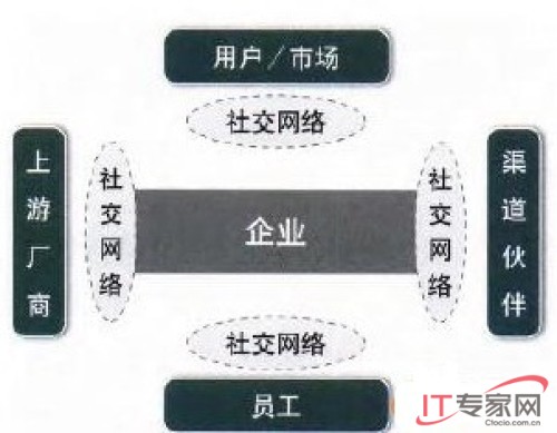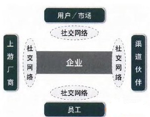 近几年来,越来越多的企业开始使用社交网络,而且运用也越来越熟练。不少曾经忽视社交网络的企业都吃了大亏,比如被罗永浩穷追不合的西门子;而重视并且善于利用社交网络的企业则尝到了甜头,比如通过玩转微博实现品牌传播的杜蕾斯,利用微信实现自助服务的招商银行,通过豆瓣微博营销实现票房大卖的《失恋三十三天》。但是总体而言,大部分企业对社交网络的应用还只是在市场营销和客户服务领域——与客户的交流上。其实,社交网络的能量超乎我们的想象,它对于企业来讲,绝不仅仅只是一个CRM的工具。我们不妨将企业所处的生态环境简单分为:一上一下,一左一右。