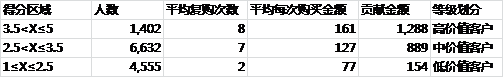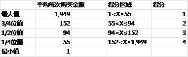 B.购买金额打分。将平均每次购买金额进行四分位分区,为其购买金额打分。