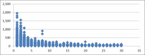A.购买频率打分:从下图我们能看到用户购买频率越高,其每次购买金额不高。为了挖掘出“购买频率高,购买金额高”的人群。我们将购买频率在5次以下的用户(共计有10,252人)其购买频率得分即为其购买频率,购买次数在6次(含6次)以上的人统一得分为6分。