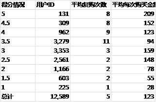 按照降序排列,我们能得到一组数据:12,589个消费者;平均复购次数在5.5次;平均购买金额在429元的一组数据。将原来6万条记录,变成了12,589条数据。