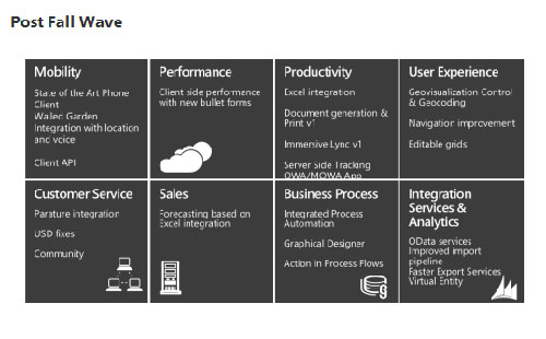Sallin的文章指出,该版本为“网络优先”(Online first focus),文章列出了即将发布的更新版里更简单的注册和配置、更快的自助服务和多区租户的等重要功能。表里还提到“CRM网络客户端里的强大商业智能”(Power BI in CRM Web client)(强大商业智能是微软Office 365的商业智能服务。)该产品的“用户体验”更新里包括多实体搜索。