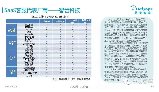 11月3日,易观国际重磅推出《2015中国企业级SaaS市场年度综合报告》,报告从市场行业整体、市场潜力、市场用户及厂商运营等维度深入分析当前国内企业级SaaS服务发展现状,并对未来的企业级SaaS市场风向做出预判——2016年,企业服务SaaS规模将超300亿。以人工智能为核心,致力于以技术驱动客服行业变革的智齿客服,作为唯一一家在线客服领域企业上榜,与销售管理领域代表销售易、协同领域今目标、人力资源管理领域北森等厂商一道,成为当前国内SaaS发展的样本。
