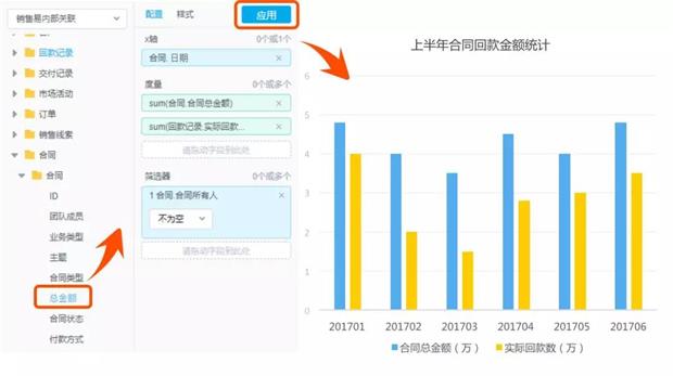 举个例子:一位销售经理想要查看团队上半年合同回款金额统计情况。有了销售易智能分析云的帮助,不用再求助IT,不用再经历长时间的苦苦等待,只需在合同的下拉菜单中将“总金额”、“实际回款金额”和“日期”这三个字段拖曳到“视图设置”区域,再轻轻点击“应用”按钮,数据很快就可以进行可视化呈现,方便用户查看。