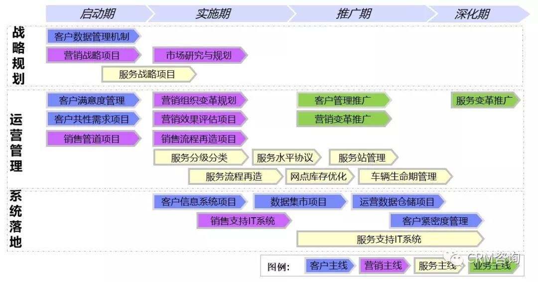 如上图所示,该CRM规划是非常经典的CRM规划方法,即水平的CRM规划方法。按战略规划、运营管理和系统落地三个维度,从客户、营销、服务和业务四条主线进行CRM规划。