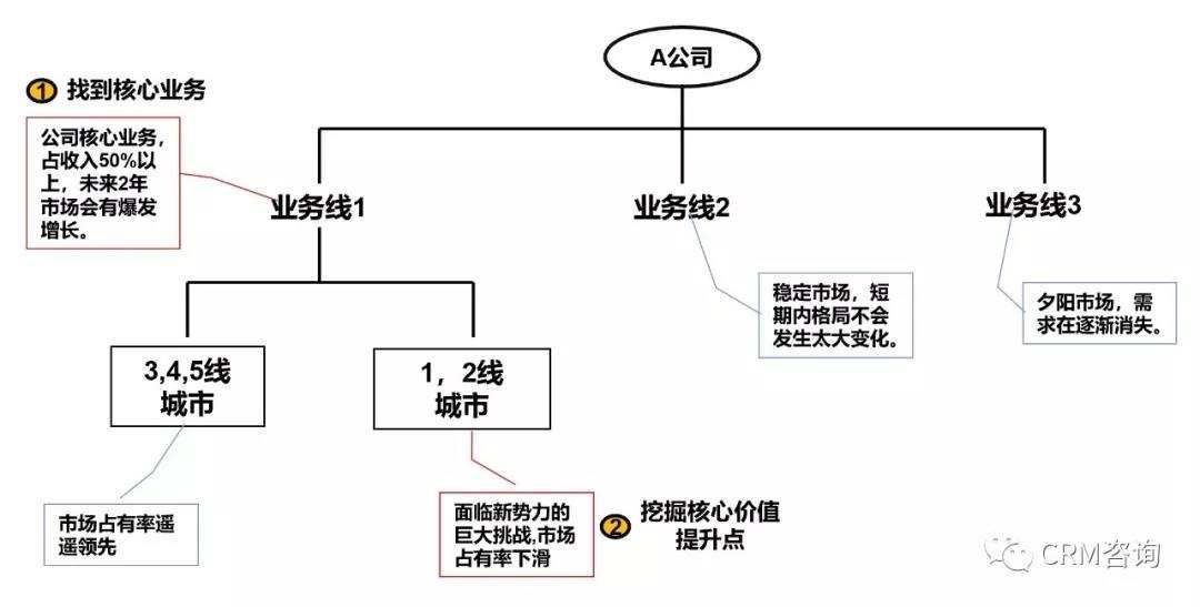 如上图示例,在以业务价值为导向的CRM规划中,我们首先要了解客户的业务分布,找出客户的核心业务,以及未来潜力最大的业务。从这些业务中发现哪些地区、哪些领域、哪些行业、哪些产品或方案存在问题。上图示例中,企业是在1,2线城市中,核心业务遇到了新势力的巨大挑战。