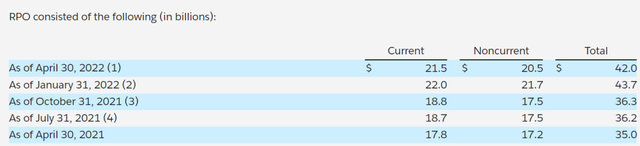 截至第一季度末,Salesforce剩余履约价值约为420亿美元,同比增长20%。目前剩余的履约价值在第一季度末约为215亿美元,同比增长21%,按固定汇率计算增长24%。