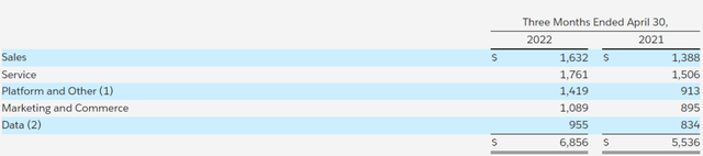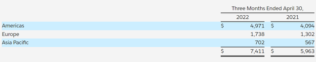 最新财报显示,截至2022年4月30日的2023财年第一季度,Salesforce业务收入为74.1亿美元,同比增长24%,业绩增长强劲。