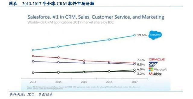 从 CRM 领域来看,Salesforce 的市场占有率接近 20%,并且不断提升,呈现强者恒强的趋势。IDC 数据显示,自2013 年以来,Salesforce 连续五年蝉联全球 CRM 市场第一,并且市场份额持续提升,2017 年 Salesforce 的市场占有率达到 19.6%,超过位居第二、三、四名的 Oracle、SAP 和微软的市场份额之和。与此同时,老牌的 CRM 厂商 Oracle和 SAP 的市场份额却处于持续下滑中。有分析认为,在 SaaS 快速发展的浪潮下,Salesforce 的市场份额有望继续提升。