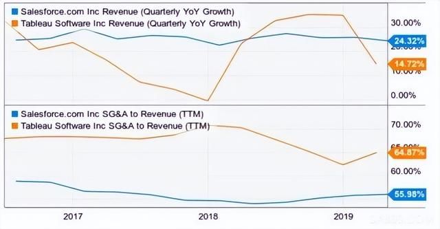 对Salesforce来说,不仅需要付出高价收购的代价,同时整合Tableau后,还会在短期给其财务业绩带来一定的拖累。