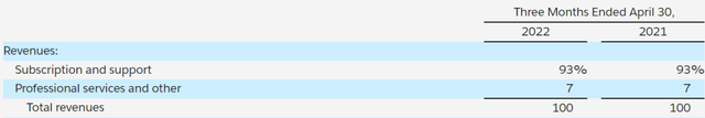 将业务收入按产品划分,订阅和支持的收入占比93%,专业服务和其他占比7%。