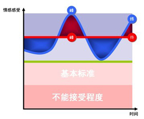 左图有三条情感曲线(蓝色,红色和绿色),代表了在自然时间顺序下客户在展厅和服务中心从开始到结束的不同感受状态。将每个子流程的情感体验评分连接起来,就形成情感曲线™(Emotion Curve™)。假设绿色的情感曲线™代表了汽车制造商和经销商,为了保持行业中的竞争力而设定的基本标准。红色的情感曲线™代表的是大多数企业目前期望达到的优良体验,是全面水平都比基本标准高的一个体验交付。根据峰终定律,体验中的所有的子流程都不是同样重要度的,客户只会记住峰与终的体验,如图中红色圆点标注。但是,如果我们用一种非传统的方式去分配资源——从而创造出一个具有明显的高峰和低谷的情感曲线™(图中蓝色)和传统的做法(图中红色的情感曲线™)相比——是一个更有效的体验,也就是一个拥有更高水平的峰值和终值的体验。我们需要投入更多的资源吗?正相反,你可能利用更少的资源,达到更好效果。(比较酒红色和海蓝色的区域总和)