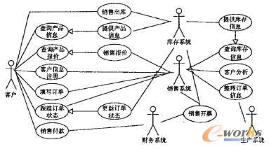 2)业务:产品信息查询,产品报价查询,客户信息注册,订单填写,订单状态跟踪,销售付款,销售出库,库存信息查询,更新订单状态,销售开票。业务用例图如图2所示。