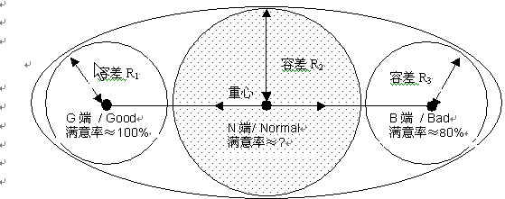 1、把话务员服务质量满意率设定为幅动区间为0%——100%的变量,以此为水平轴线,并把0%、100%两个端点定义服务质量满意率的两个极值点(如G端、B端),在端点周围存在一个赋予特定容差的近似等值区域,N端为整体(或部分)服务质量满意率的平均值的值点。在容差范围内,我们把低于或高于某既定值(如极值、重心值)的分值都近似的认为是等于该既定值,由此形成一个近似的等值区域。我们可以把等值区域视为一个近似的圆,则把容差理解为以某端点为圆心的圆形的半径(Radius)。