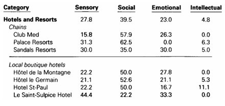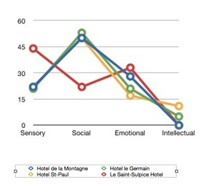 你将得出这样的结论:Le Saint-Sulpice酒店(巴黎)将成为你的竞争对手,因为该酒店在社交这部分的体验价值最低。而在感官这一部分上的价值最高。