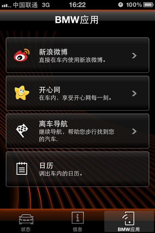 ? 应用——娱乐资讯,随行无间:从2012年4月起,用户下载“BMW互联应用”到iPhone手机上,并将其连接到BMW车辆,即可使用iDrive系统浏览使用BMW或第三方开发的App应用。目前,该功能已包括新浪微博、开心网、日历、百度音乐、豆瓣FM等,离车导航功能在活动中也进行了展示。