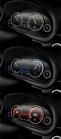 借助可编程全彩色液晶显示仪表盘,传统仪表的显示内容完全由液晶图像显示生成,为驾驶者带来了全新的显示选择。车辆在COMFORT、SPORT和ECO PRO等驾驶模式下,拥有各自的色彩、内容显示方案,使驾驶者能够从与当前驾驶状况对应的仪表显示中获益。比如,在ECO PRO模式中,转速表将显示任一时刻的车辆驱动效率。如果油门踩得过急,则整个显示屏会变成灰色,并且显示有多少燃油正在被浪费。在SPORT模式中,显示屏刻意换成简洁的风格,只为驾驶者提供最需要的信息,这样就可以避免分散驾驶者对前方道路的注意力。