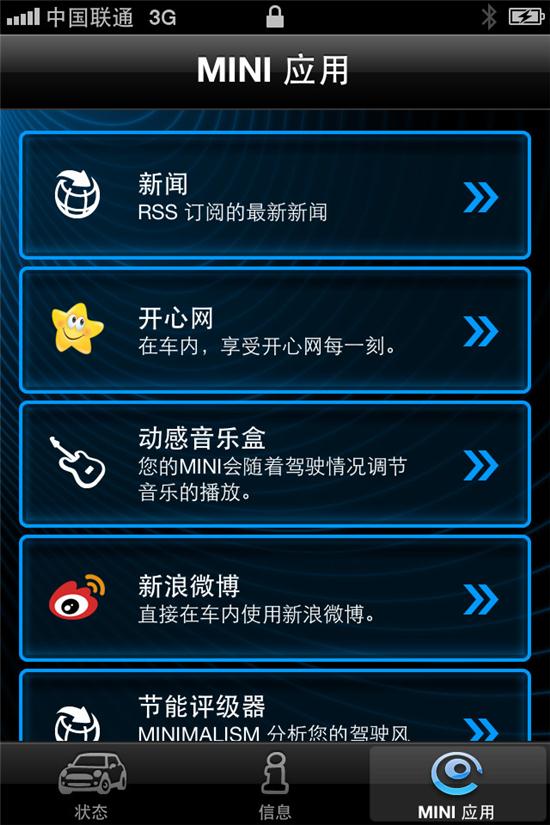 2010年,宝马集团率先在MINI汽车上实现了苹果iPhone手机应用程序、移动互联网络与车辆导航、娱乐信息系统的整合。