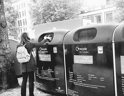 在英国,伦敦街头的垃圾分类十分严格,清洁承包商和市民都严格遵守执行。图为一名女子在扔垃圾。