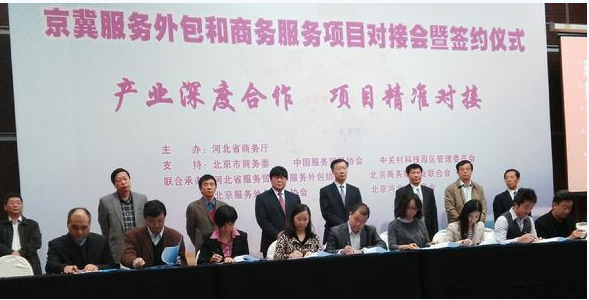 中国发展网 刘珊珊报道 10月28日,京冀服务外包和商务服务业项目对接会暨合作项目签约仪式在北京举行,300多家河北企业和100多家北京企业进行了服务外包项目的交流、对接和洽谈。