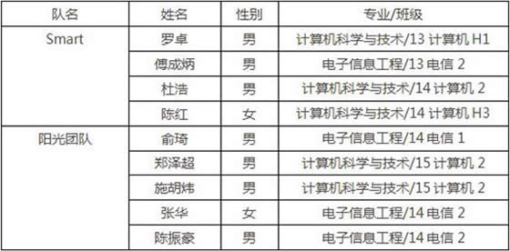 全校共有9组队伍报名参加校赛,于5月11日在赛南412举行校赛,学院邀请陈晓竹、高波涌、闻育、姚伏天和杨静华老师作为评委,选出7支队伍报名参加省赛。7支队伍经过省赛网络初评,最终“阳光团队”和“Smart”2队伍进入省决赛。在姚伏天和雷凌2位老师精心指导和2支队伍认真备赛下,最终“smart”队伍获得省二等奖、“阳光团队”队伍获得省三等奖。