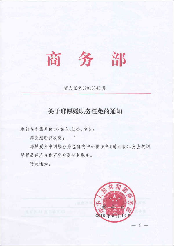 邢厚媛任中国服务外包研究中心副主任(副司级),免去其国际贸易经济合作研究院副院长职务。