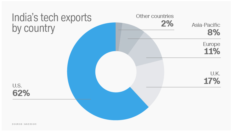 数据显示,印度科技行业规模高达1500亿美元,印度外包行业逾60%的海外收入均来自于美国,其在美国的客户包括洛克希德马丁、IBM,以及美国陆军和海军。