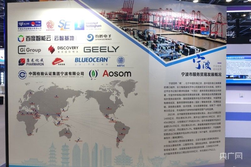 日前,2022年中国国际服务贸易交易会在北京开幕,宁波共派出15家服务贸易龙头企业参展,围绕信息技术研发服务、电子商务平台服务、供应链管理服务、管理咨询服务、文化创意服务、医药研发服务、检验检测服务、人力资源管理服务等重点领域,集中展示在服务外包示范城市建设方面的成果。