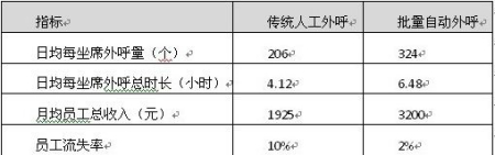 另外,除了能提高工作效率之外,使用批量自动外呼还能有效提高业务员的收入,从而降低流失率,给电话销售中心的运营带来质的提升。下表是某寿险公司成都电话销售中心(赠险)使用Hi-CC自动外呼后,业务指标、员工收入和流失率的改变情况: