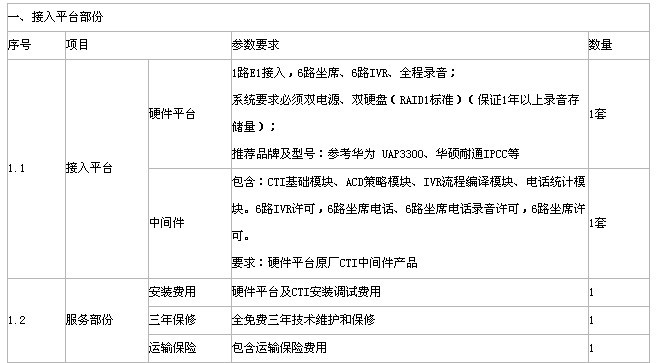 | 1.1 | 接入平台 | 硬件平台 | 1路E1接入,6路坐席、6路IVR、全程录音; 系统要求必须双电源、双硬盘(RAID1标准)(保证1年以上录音存储量); 推荐品牌及型号:参考华为 UAP3300、华硕耐通IPCC等 | 1套 |