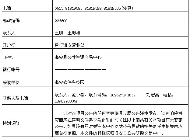 针对该项目公告的任何变更将通过原公告媒体发布,谈判响应供应商应在谈判文件递交截止时间前关注以上网站有关本项目有无变更公告。如果没有及时关注本中心网站公告导致的相关责任由相关供应商自行承担。本文件的解释权归海安县公共资源交易中心。 |