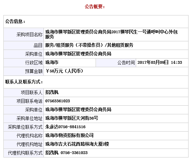 珠海市横琴新区管理委员会商务局2017横琴民生一号通呼叫中心外包服务单
