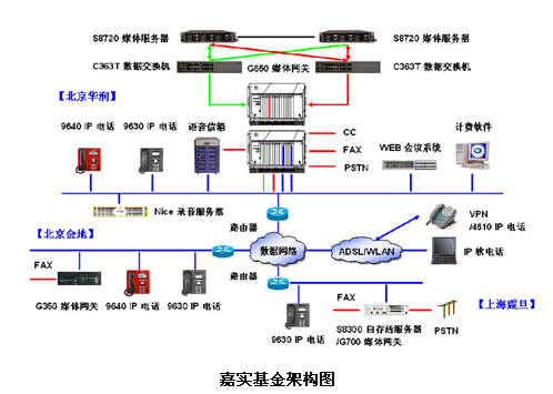 (1)IP语音通信:在本次方案中,嘉实基金北京华润总部选用了AVAYA最新的Communications Manager 软件和基于安全可靠的S8720媒体服务器硬件平台;上海嘉实基金则选用G700媒体网关选用了S8300媒体服务器,实现通过IP网络和北京总部链接,并可在网络中断的情况下,实现LSP自存活的功能,保持语音通信服务不间断;嘉实基金北京总部交换机和上海分部交换机通过IP中继通道,实现北京和上海两地的办公电话互连互通,并为公司节省大量长途通信费用。