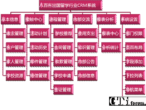 八百客出国留学行业CRM系统可以覆盖六大功能:基本信息管理,接触管理,进程管理,内部交流管理,报表管理和系统设置。