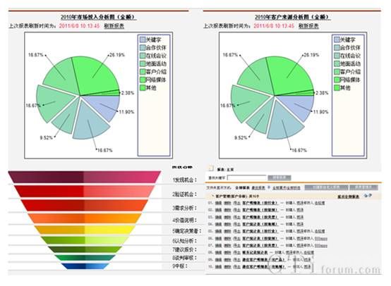5. 八百客报表中心功能可以为我们提供强大的报表分析功能,如图:以市场投入分析图和客户来源分析为例,在市场投入分析图中,系统可以自动统计出市场活动的投入-产出比,自动分析出获得客户和流失客户的原因;客户来源分析可以呈现给市场管理部门每次活动可以带来的有效客户率;销售漏斗还会帮助留学顾问和管理人员统计出潜在客户的转化率,有利于客户发挥优势,避免劣势,更好的地策划市场活动和为客户提供针对性地留学服务。报表的统计类型客户可以选择多种图形—例如,大饼图,柱状图,趋势图等等,八百客留学教育CRM系统为客户提供了20多种可供选择的图形。系统会自动根据地域、行业、收入、类型、级别、地域、已付费,未付费,学校区域等等关键字生成报表,系统提供报表导出功能。