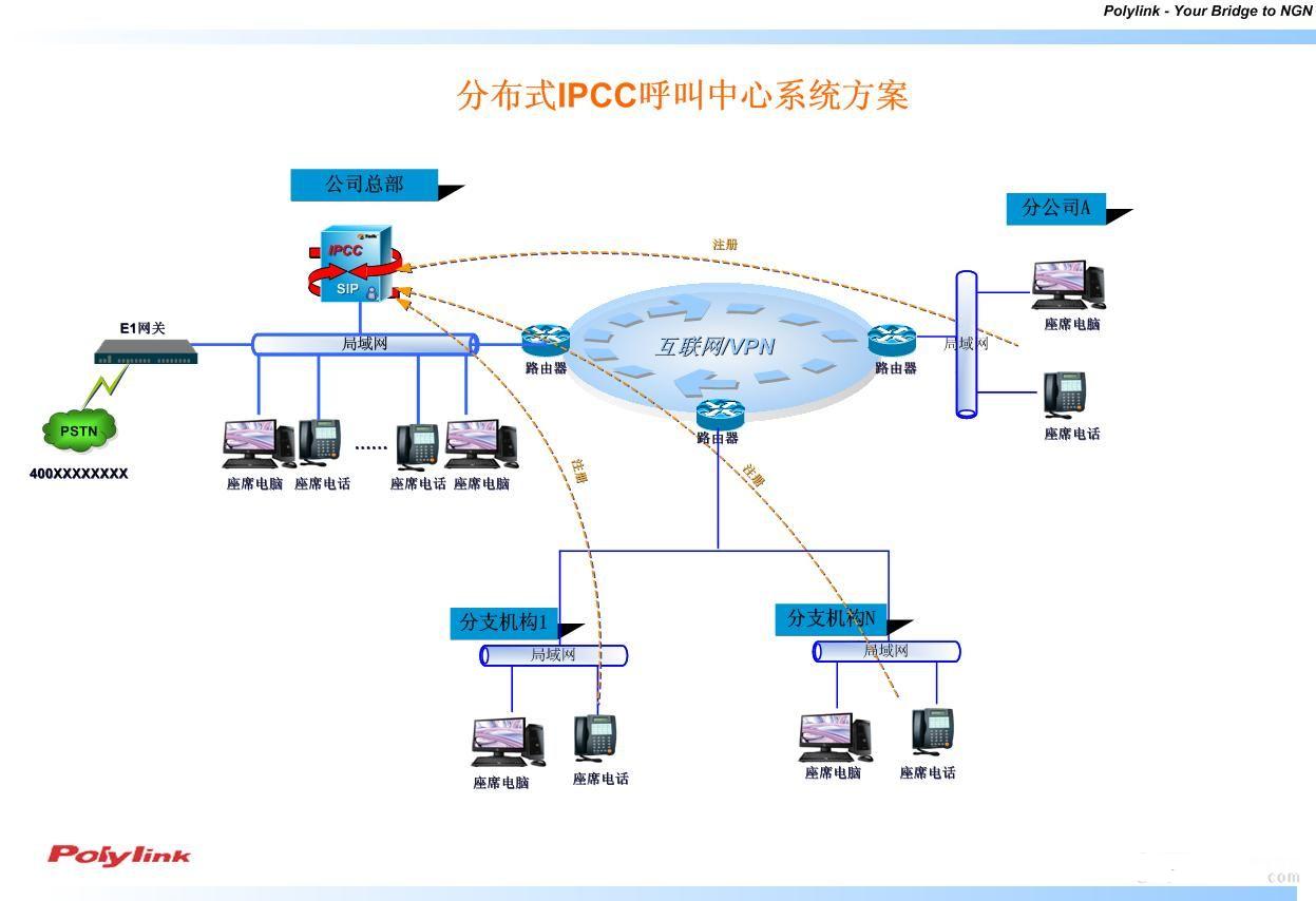 目前总部在上海,希望在总部建设一套基于IP的呼叫中心系统,同时可以兼顾其他分支机构接入,作为远程座席接入,实现异地办公集中服务的IPCC呼叫中心系统,更可以通过公网签入远程班长坐席,对话务员的实时动态进行监控和管理。