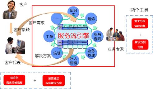 实现了呼叫中心软件以“功能为中心”向以“客户为中心”的转变,基于“服务流引擎”,即以客户需求为核心,将呼叫中心系统转变成随业务而动的标准化、流程化的新一代呼叫中心软件平台。