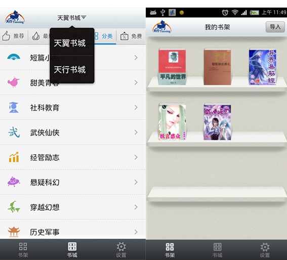 既然天行听书的语音交互体验和软件功能都这么好,那么图书资源呢?天行听书目前已经整合了天翼书城、天行书城这两大图书渠道的来源,并且每天都在添加大量各种经典的、最热最火的图书。即使没有找到你心目中的书籍,也可以通过导入的方式,将自己心仪的书籍从手机中导入到天行听书的书架,从而体验听书的乐趣。通过书籍来源多样化的角度,为您提供了更加自由的选择。