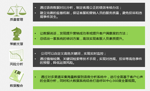 目前金融、保险等行业业务系统长期饱受用户流失率高、新增用户发展缓慢等问题的困扰。通过利用语音大数据分析技术进行挖掘,产生新的应用方向,我们以金融、保险行业语音大数据进行分析,通过采用语音分析技术,将语音转化为文本信息,进行关键词抽取,通过对这些文本特征进行统计及专业化分析实现几方面应用: