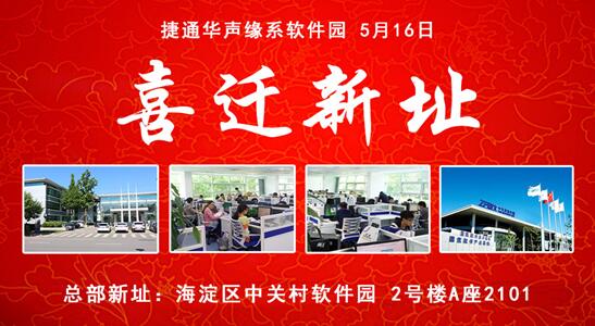 由于公司发展需要,捷通华声北京总部于5月16日正式搬迁至新办公大楼,地址:北京市海淀区中关村软件园2号楼A座2101。