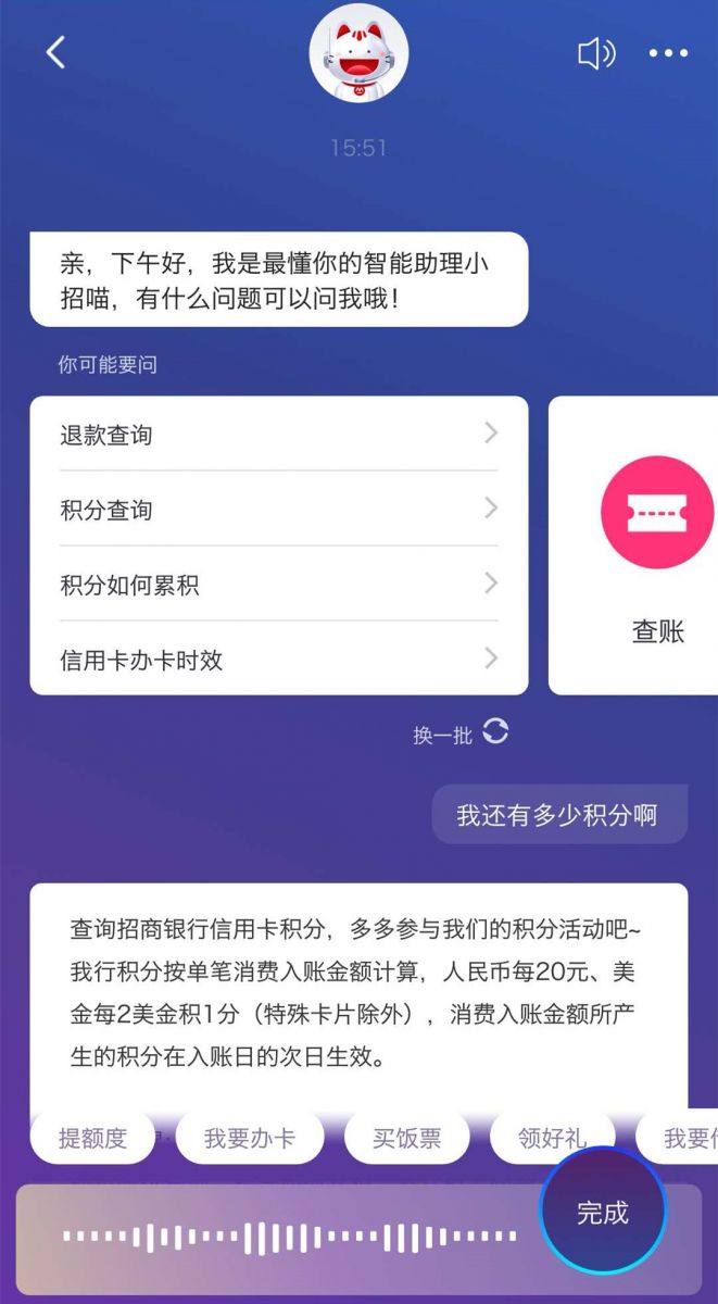 近日,捷通华声推出的灵云全智能能力平台成功服务招商银行信用卡中心,将灵云语音识别、语音合成技术全面赋能招商银行,从而让“掌上生活”APP及招行网页端、微信端等智能客服拥有更便捷的语音交互能力,助力招行实现业务场景、客服场景的全面智能化升级。