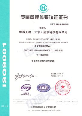 近日,北京海德国际认证有限公司来中通天鸿进行质量管理体系认证,在公司全体部门积极配合下,中通已于4月17日正式通过国家质检中心的认证。标志着我们智能通信系统的开发和服务完全符合GB/T19001-2008 idt ISO 9001:2008的标准。