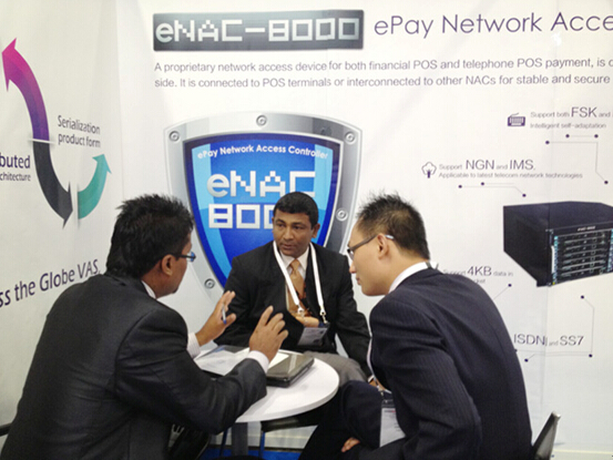 值得一提的是,eNAC-8000电子支付网控器首次亮相亚洲通信展,受到现场嘉宾的高度关注和积极好评。eNAC-8000电子支付网控器是全新一代应用于金融POS支付的专用网络接入设备,可灵活广泛地应用于金融POS以及电话POS,部署于银行、收单机构端,用于与POS机互联或者与其他NAC级联,实现POS机、各网络节点的交易数据的安全以及稳定。